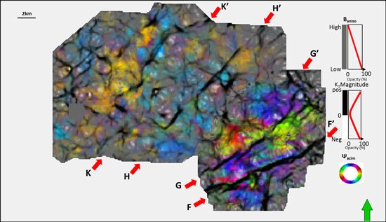 Phantom horizon slices 20 ms above the top Viola limestone through amplitude vs. azimuth (AVAz) anisotropy strike Ψazim modulated by its value Baniso. Most-positive curvature is plotted against a gray scale and shows subtle faults. The survey in the NW has been hydraulically fractured while that in the SE has not. Note the compartmentalization of azimuth in the upper left survey, where curvature acts as fracture barriers. Note the stronger anisotropy (brighter colors) in the SE survey which had not yet been hydraulically fractured. (Image courtesy of Shiguang Guo, OU).